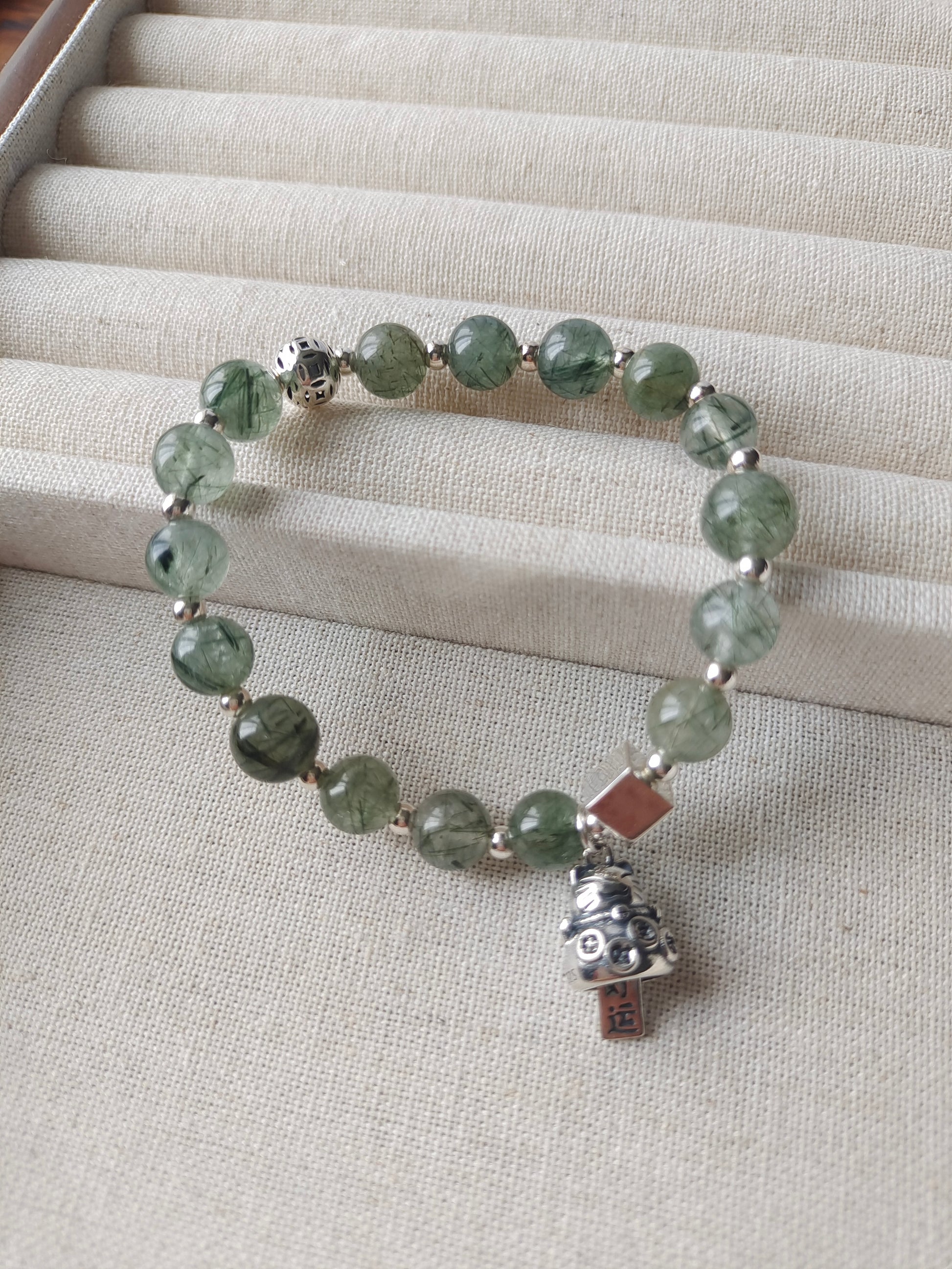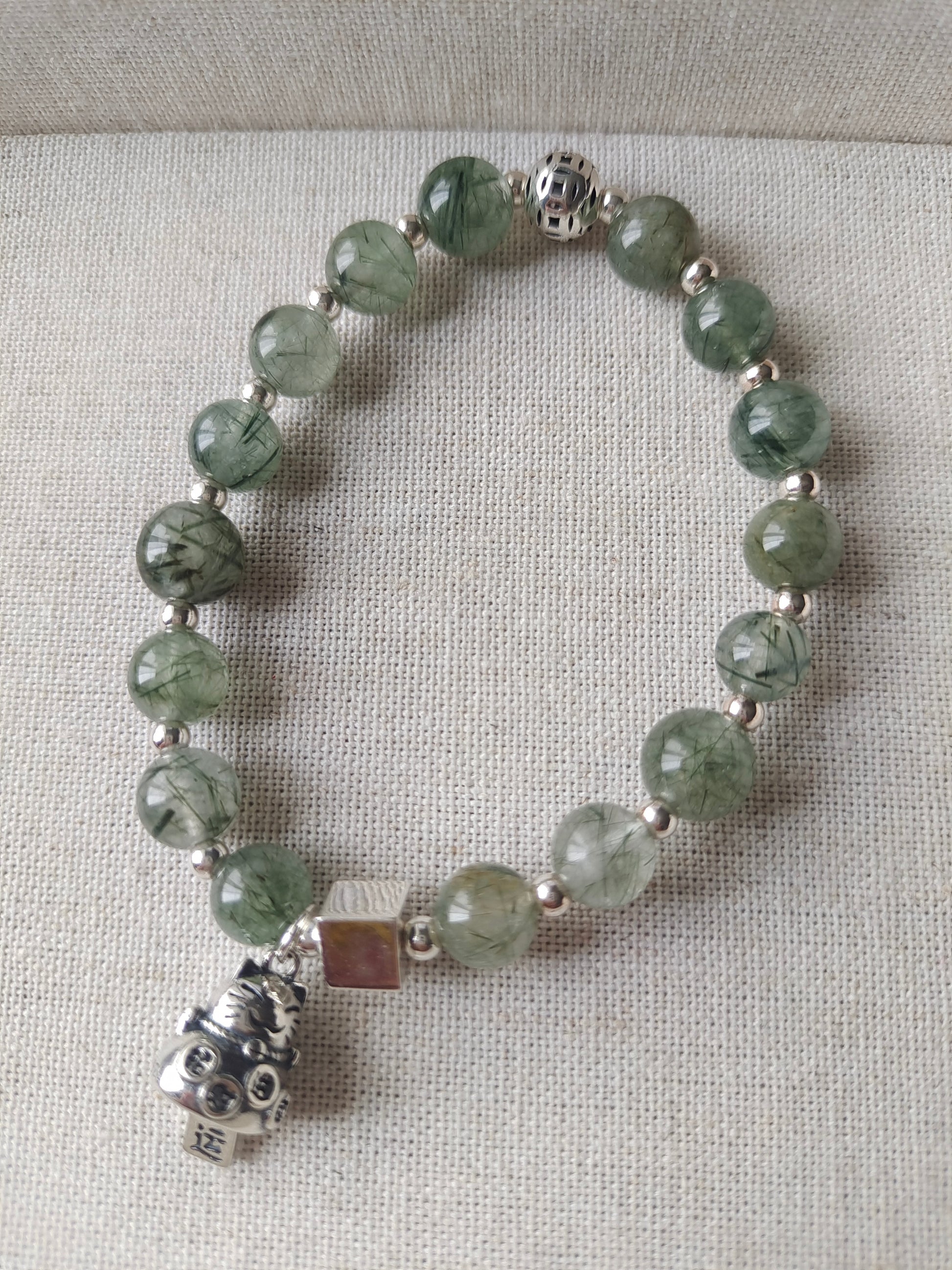 Your lucky charm here with silky green stone and well known Maneki-neko that symbolize good luck, health and wealth. You also see a square chinese character "福“, which means "luck". A very happy piece you would cherish for.